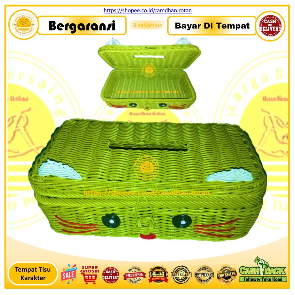 Cukup jadi follower atau ikuti toko kami, bisa dapat voucher diskon belanja harga promo dan update produk terbaru dari toko kami.Wajib Baca Deskripsi, Biar Gak Salah PahamTempat Tisu Karakter (polos by request) Bahan Anyaman Rotan SintetisUkuran : Panjang : 24cm Lebar : 14cm Tinggi : 9cm Rotan Sintetis adalah rotan berbahan plasticTersedia Warna : hijau, ungu, merah, pink, biru, orange, putih, hitam, kuning, coklatRequest warna hanya untuk warna dasar, warna kombinasi disesuaikan dari pengrajinRequest Warna, Tulis di kolom keterangan atau konfirmasi setelah check out order, Tidak ada request, maka di kirim random.Jika warna yang di reques kosong, kami akan konfirmasi terlebih dahulu, 8 jam tidak ada tanggapan, akan di kirim secara random.Request Warna Tidak Berlaku untuk variant Warna Random.Pilih Variant Sesuai KebutuhanKlik barang : klik beli : pilih variant : lanjutkan ke pembayaranVariant Produk :Warna Random : Warna stok yang adaRequest Warna : Warna Bisa RequestPacking Biasa : Packing hanya menggunakan plastik biasaPacking Bubble Wrap : Packing menggunakan Bubble WrapPacking Kardus : Packing menggunakan kardusPacking Kardus Bubble : Packing menggunakan kardus dan bubble wrapBubble wrap adalah sejenis plastik bergelembungKerusakan barang pada saat pengantaran kurir, di luar pantauan kamiCATATAN :1. Rekam Pada saat membuka paket2. Prioritas Kiriman Untuk Yang Lebih Dahulu Memesan3. Jika Ingin Memb@t4Lkan Transaksi, Silahkan Hubungi CS SHOPEE (bukan dari pihak penjual)4. Keterlambatan Pengantaran Barang Oleh expedisi Di Luar Wewenang Kami, Kami Hanya Bisa Bantu Follow UpProsedur R3tur ?? 1. klaim r3tur tidak berlaku jika tidak memberikan bukti vidio rekaman pada saat membuka paket serta memberikan photo jelas barang disertai label alamat dan resi yang menempel pada paket2. Pergantian On9kos Kirim Peng3mbalian, Berdasarkan Berat Yang Sama Pada Resi Pengiriman Kami (tidak lebih).3. Tidak menerima kompl@in setelah dana remit ke kamiSegera konfirmasi terima pesanan, jika barang sudah sampaiMohon Maaf Jika Ada Kekurangan Dalam PelayananHarga Bersaing !! Langsung Dari PengrajinSelamat BerbelanjaTerima k